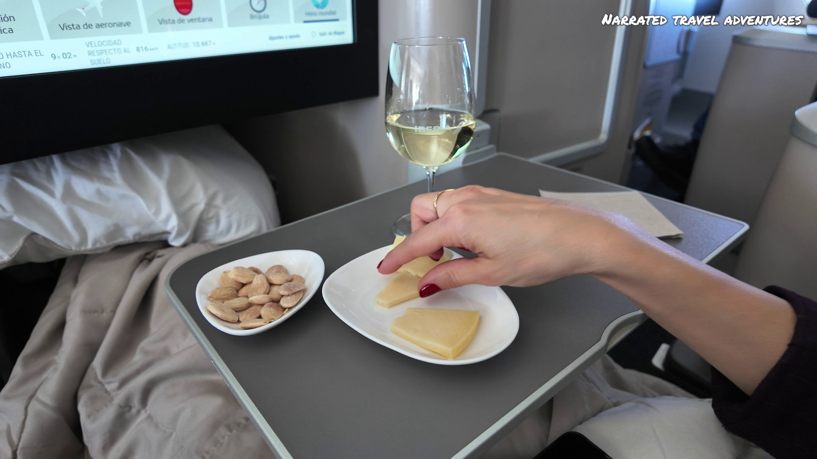 One of the perks with Business Class is the great food and service. To start of we were served a glass of Cava (or choice of drink) together with some almonds and cheese. I really appreciate that they give you a paper-menu, printed on a nice paper, fresh and clean. The food is served on nice porcelain and you get proper cutlery and glasses.