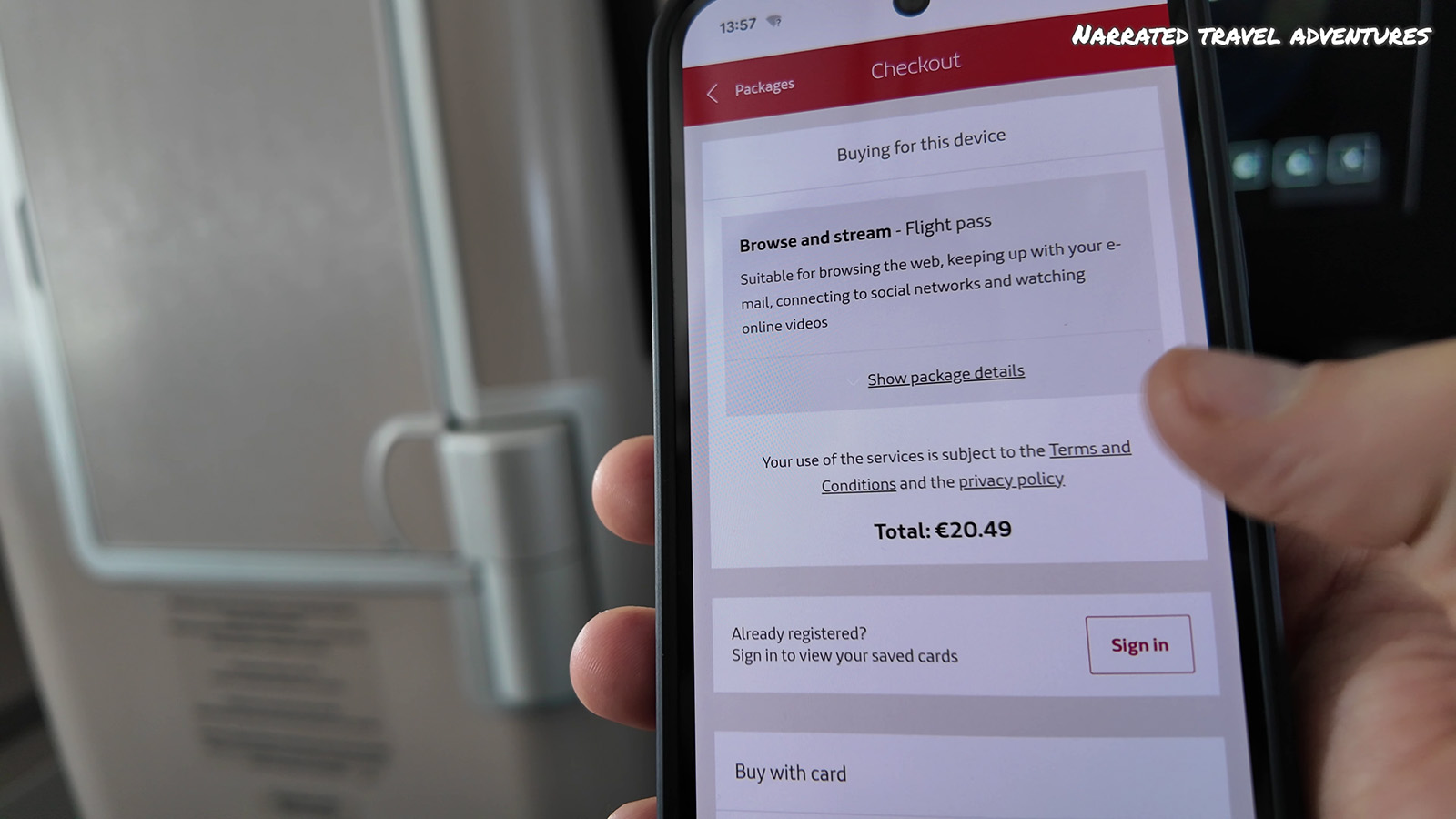 There is wifi onboard and as a business class passenger, you get complimentary wifi for messaging only. If you want a higher speed connection for streaming videos and browsing you need to pay. It costed €20.49 for the whole flight and worked very well.