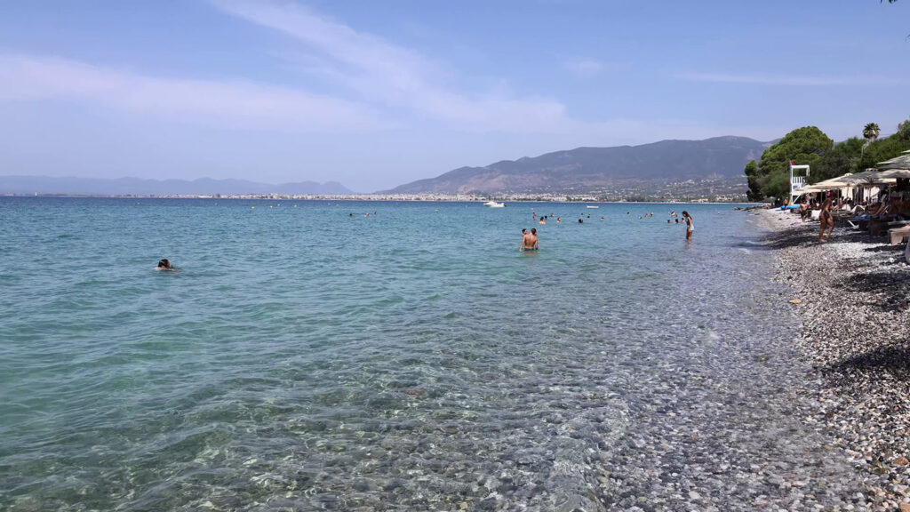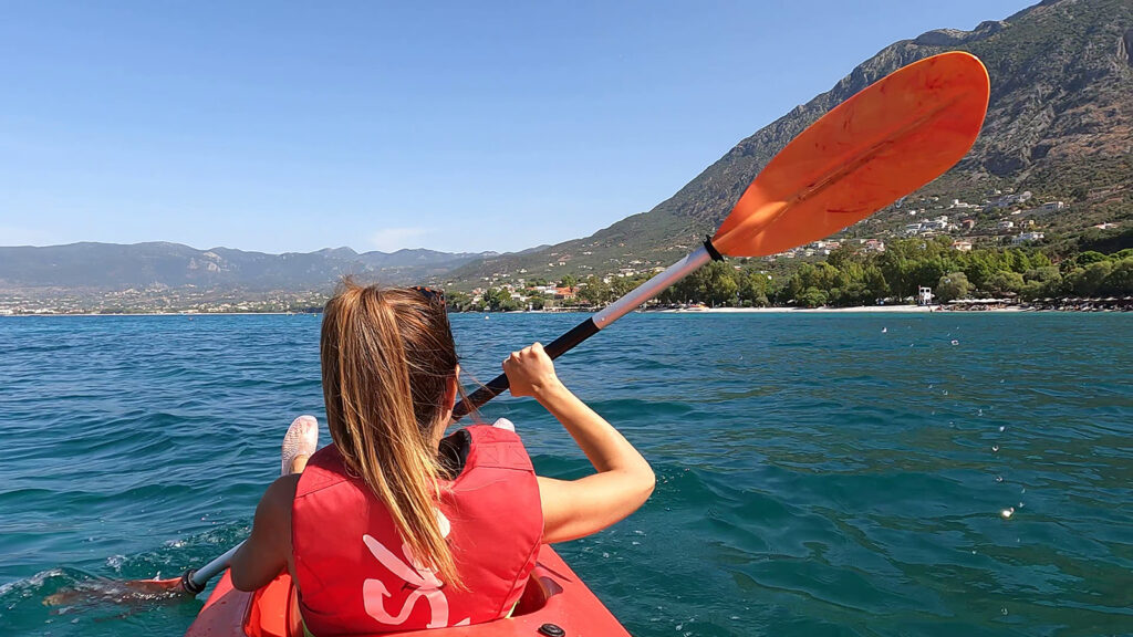 It offers a relaxed vibe and is not very touristic. Sunbeds are free if you order anything from the beach bar. The beach consists of larger pebbles but becomes sandy 3-4 meters into the water. Here you will also find Thalassa Sports that are renting out kayaks, stand up paddle boards, paddle boats and more. There prices are really good, we rented a kayak for 1 hour for only 10 euros. The next day I tried Stand Up Paddle for the same price. A peaceful beach with crystal clear water and great views with the mountains in the background.