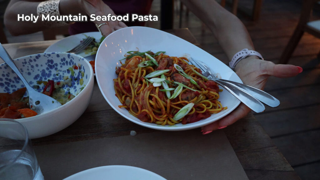 We start off with a Prawn Salad. Followed by their Grouper Ceviche. And as the main we share the Holy Mountain Seafood Pasta. Super tasty food in a beautiful spot. Service was friendly and quick. The bill came to 75 euros.