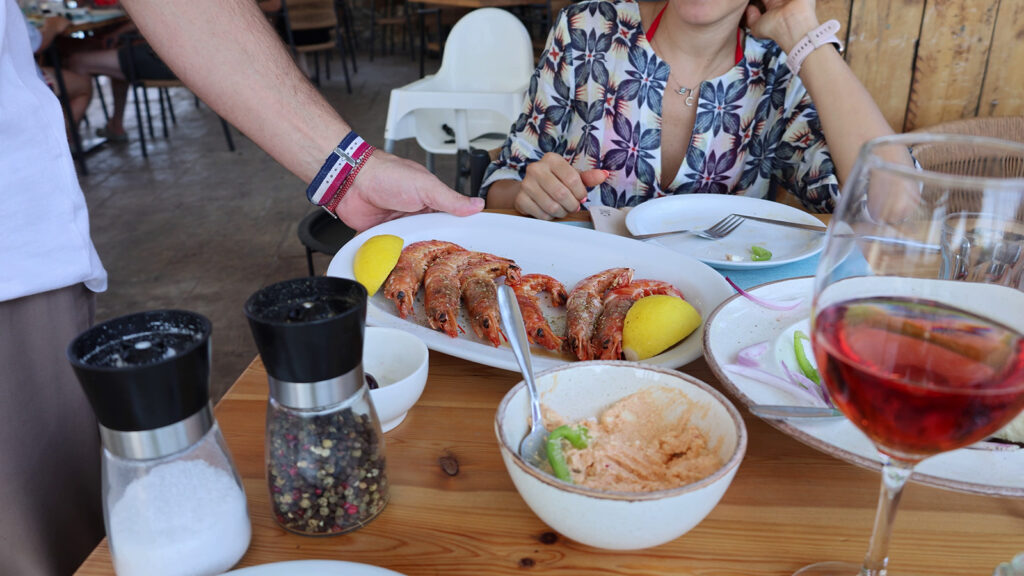 A favourite restaurant around Kalamata with really good ingredients, classical greek dishes cooked very well. Great seafood and moderate prices. We are having a Greek salad to start. And of course with plenty of Kalamata Olive oil. A grilled octopus leg together with tyrokafteri, a spicy fetadip. You can’t go wrong with grilled prawns squeezed with lemon. As a complimentary dessert we got a slice of orange cake.